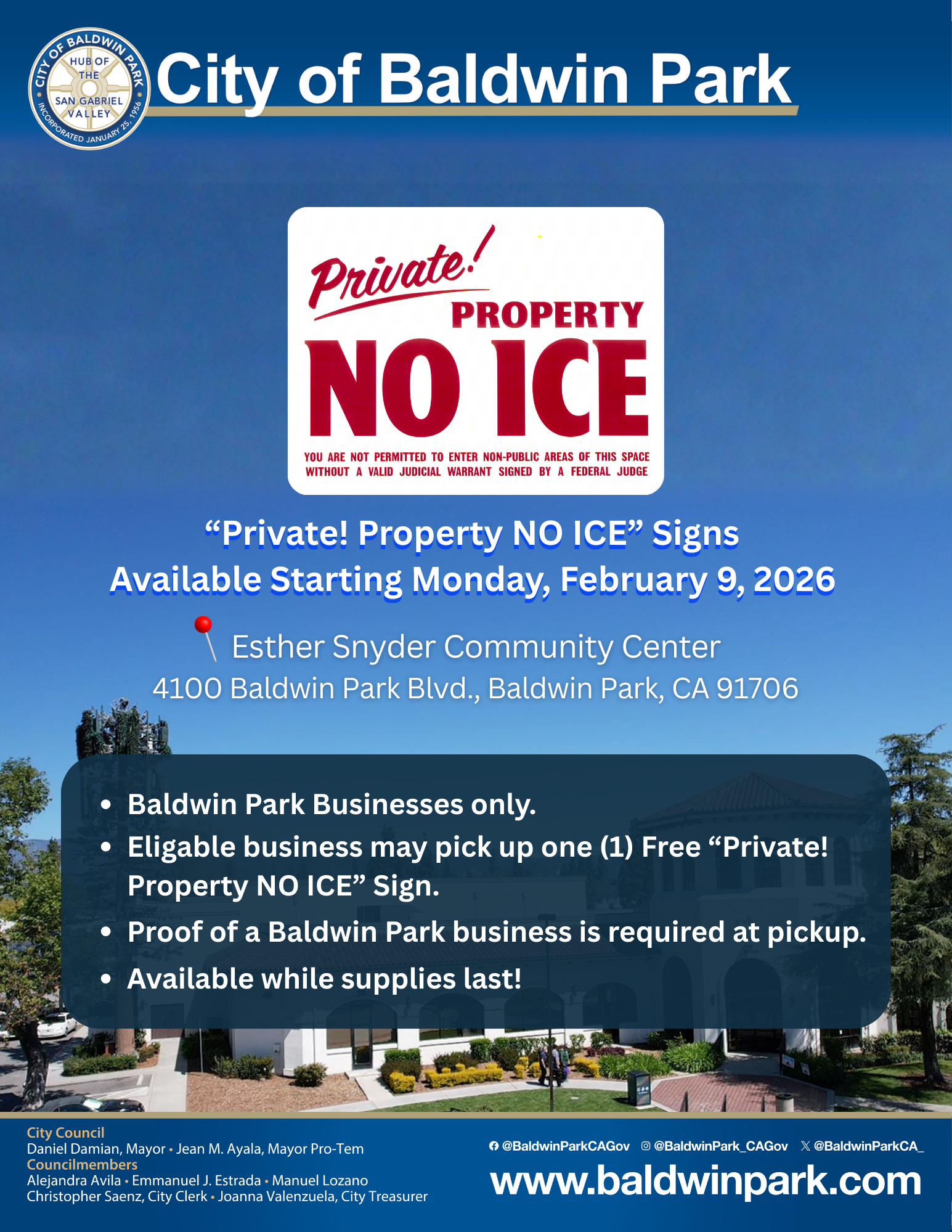 “Baldwin Park has always been shaped and strengthened by immigrant families whose contributions are essential to who we are today,” said Mayor Daniel Damian. “While the City does not control or direct federal immigration actions, we are fully committed to transparency, to safeguarding constitutional rights, and to ensuring our residents know that their City stands with them.”